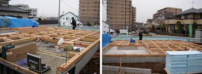 渡辺建築店さんが我孫子市緑のM様邸新築工事が始まりました。 土台4寸角を引いて、断熱材を入れて構造用合板を並べる工事です。 3尺角に土台を組、その上に構造用合板を敷き詰めますので、 床面の剛性(強さ)は、高まります。 M様邸は、40坪以上ある大きな住まいです。